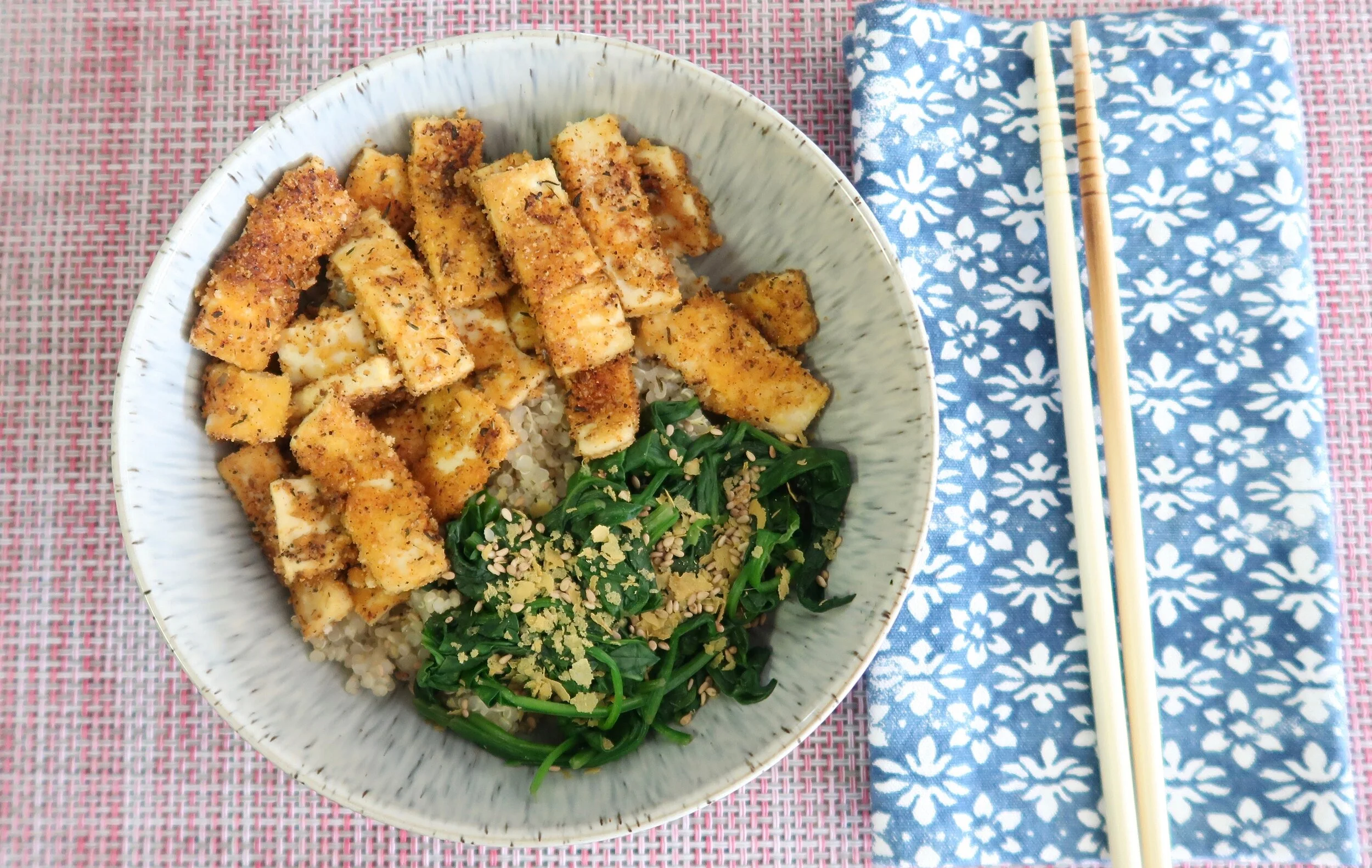 TIME TO PLATE: I love this cajun fried tofu with quinoa and plain spinach with roasted sesame seeds and nutritional yeast. The seasoning on the tofu tastes great alongside a side of plain spinach. But you can also add a little bit of chopped green onion, a dash of salt, and a droplet of sesame oil to mix in with the spinach for more flavor.